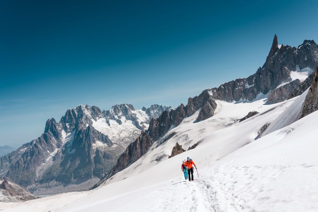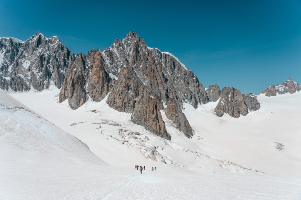 Après être passés côté italien, la cordée a pris le Skyway pour se rendre à la pointe Helbroner. Le passage dans le massif du Mont Blanc les a ensuite entraîné au col d’Entrèves pour la découverte des différentes techniques d’encordement sur glacier et le cramponnage sous les conseils d’un guide de la compagnie du Mont Blanc. Tout au long de la journée, le soleil a accompagné les participants avec des température anormalement élevées qui nous rappelle combien ce milieu est fragile et vulnérable.