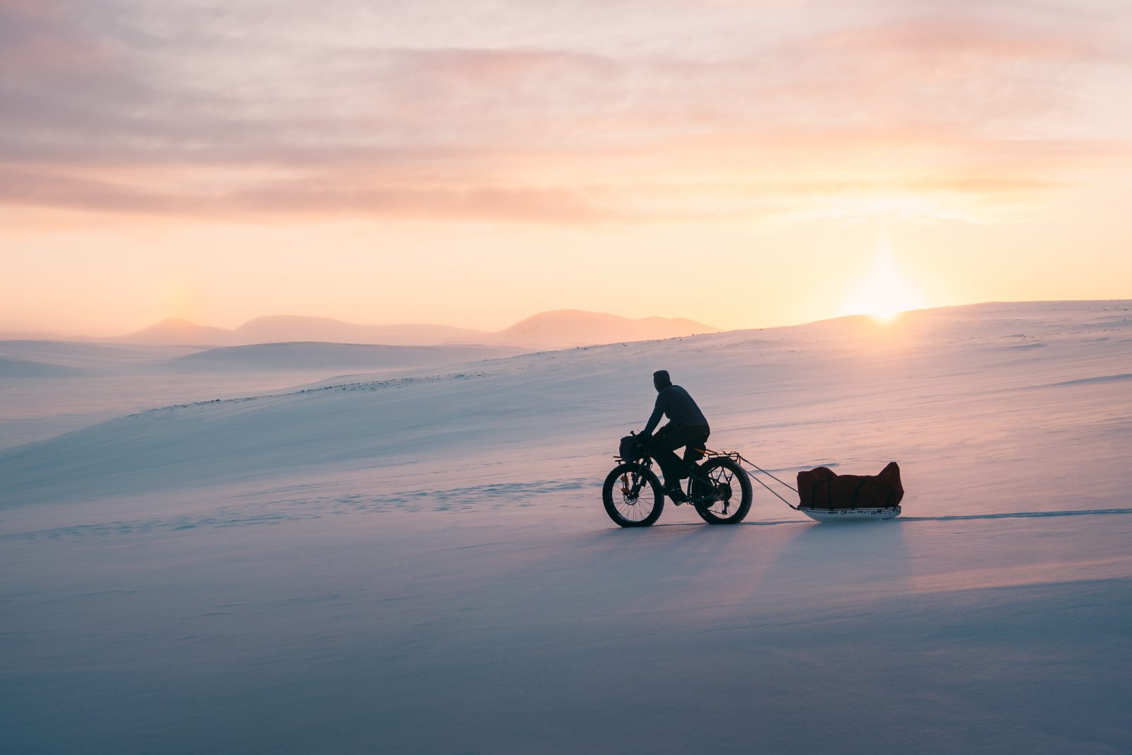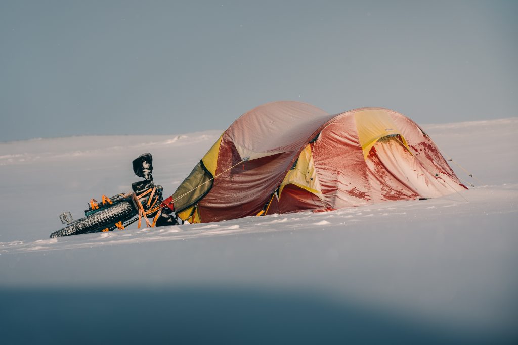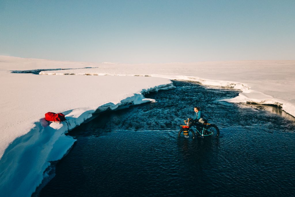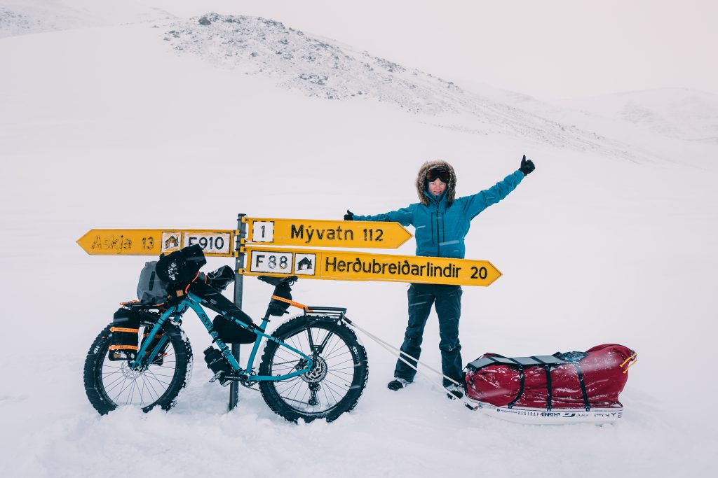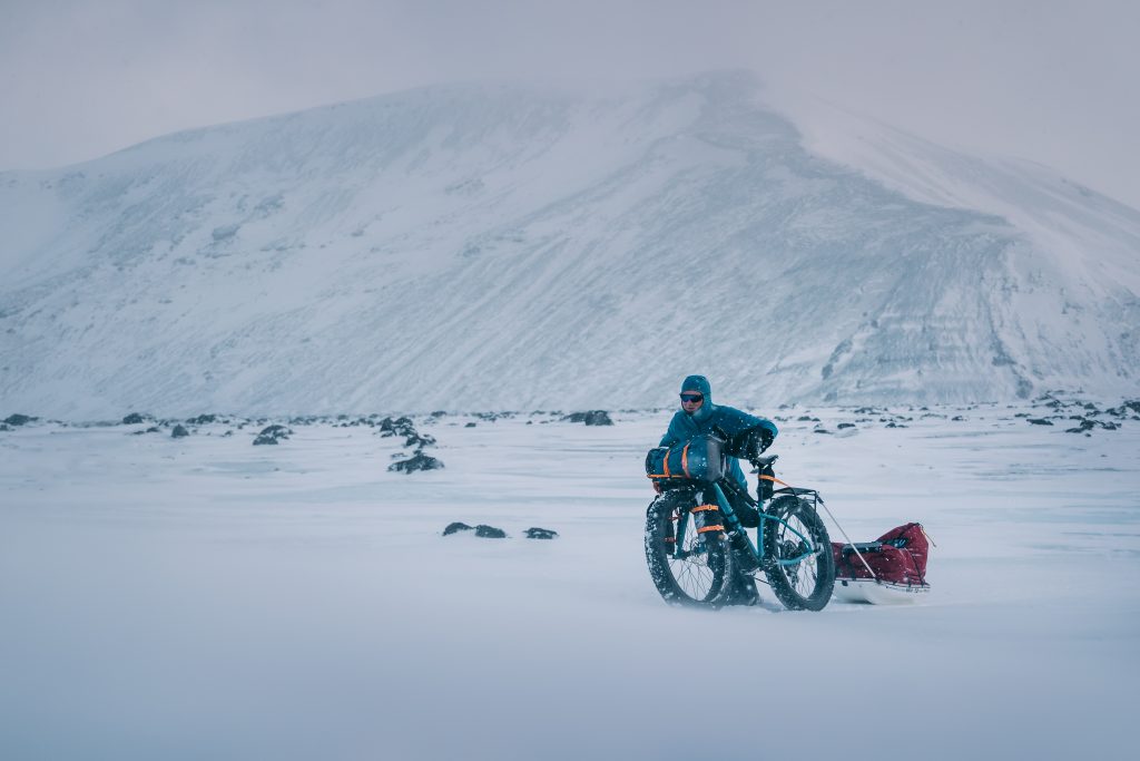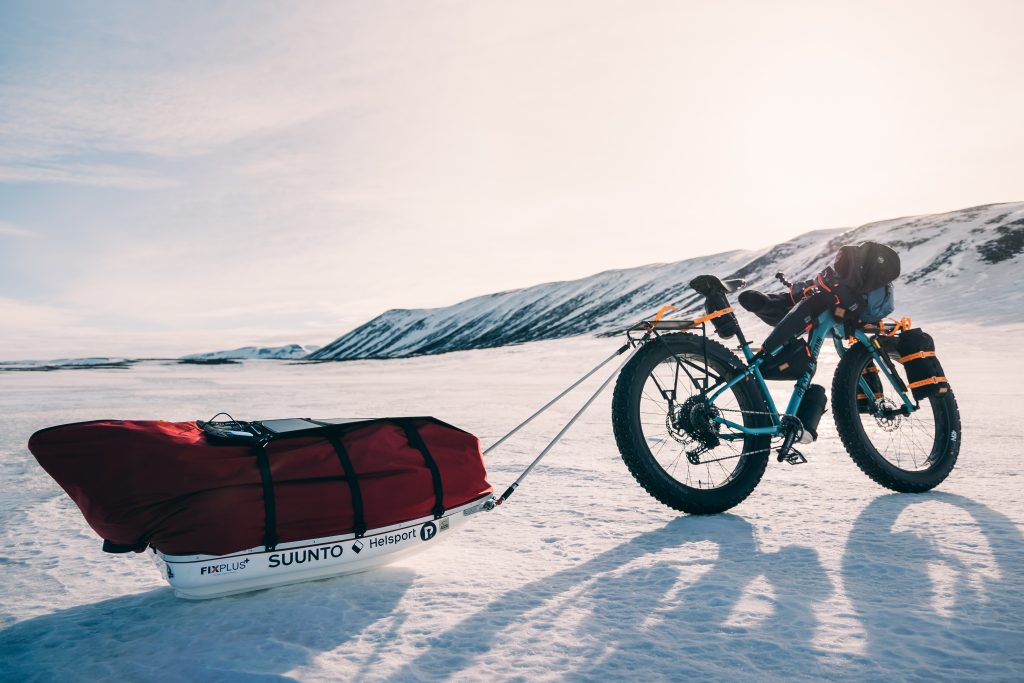 Equipé d’un fatbike tirant un pulka, “un format idéal qui me permettait d’alléger le vélo pour rouler sur la neige et de tracter pulka et vélo à pied si les conditions étaient trop difficiles pour pédaler”, Joffrey Maluski s’élance à l’assaut des régions les plus isolées d’Islande le 1er mars 2023. Des territoires marqués par des paysages lunaires, des glaciers grandioses, des vents violents et des volcans imprévisibles.
