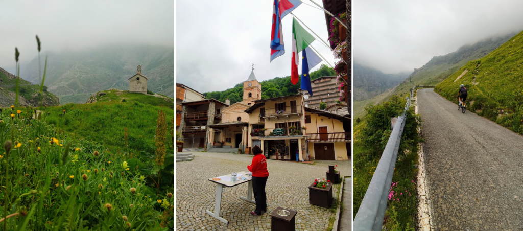 Le pendenze rimangono elevate per tutta la salita e non c'è quasi nessun posto dove prendere fiato, soprattutto a metà del passo, dove le pendenze sono massime. L'affollamento rimane ragionevole e, qualche giorno dopo, ci si renderà conto che sulle salite francesi di questo Tour dei grandi colli ci saranno molti più ciclisti. Man mano che il bosco scompare, si può godere del paesaggio e in particolare della vista sublime del Mont Viso, la vetta emblematica delle Alpi italiane con i suoi 3.841 metri. Per quanto riguarda il manto stradale, sarebbe opportuno un intervento di riasfaltatura, perché mentre in salita non presenta problemi, la discesa è un po' più complicata, con alcuni tratti sconnessi. In cima, ci attende un ristoro di base (crostate e acqua). Un fotografo era a disposizione per immortalare il momento, e così sarà per tutti i passi del Tour.