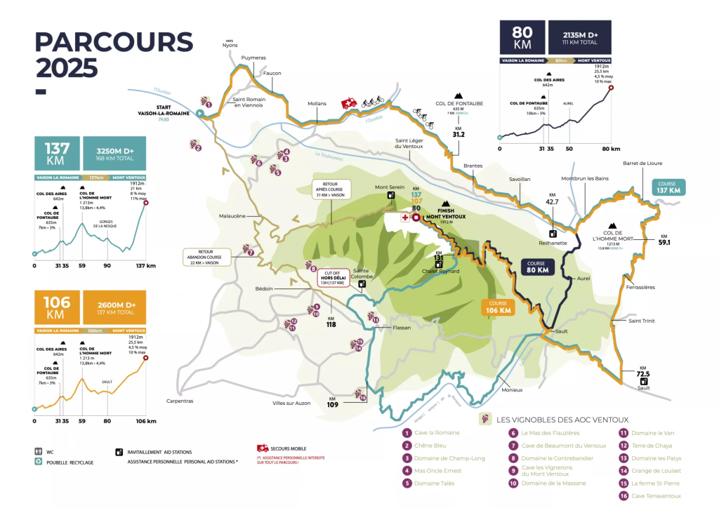 Le dimanche 01 juin, au départ de Vaison-La-Romaine (84), trois parcours cyclosportifs menant au sommet du Mont Ventoux sont proposés : le Grand Fondo, l’épreuve reine (168km, 3 250m D+), le Medio Fondo (137km, 2 600m D+) et un parcours de 80km pour 2 135m D+.